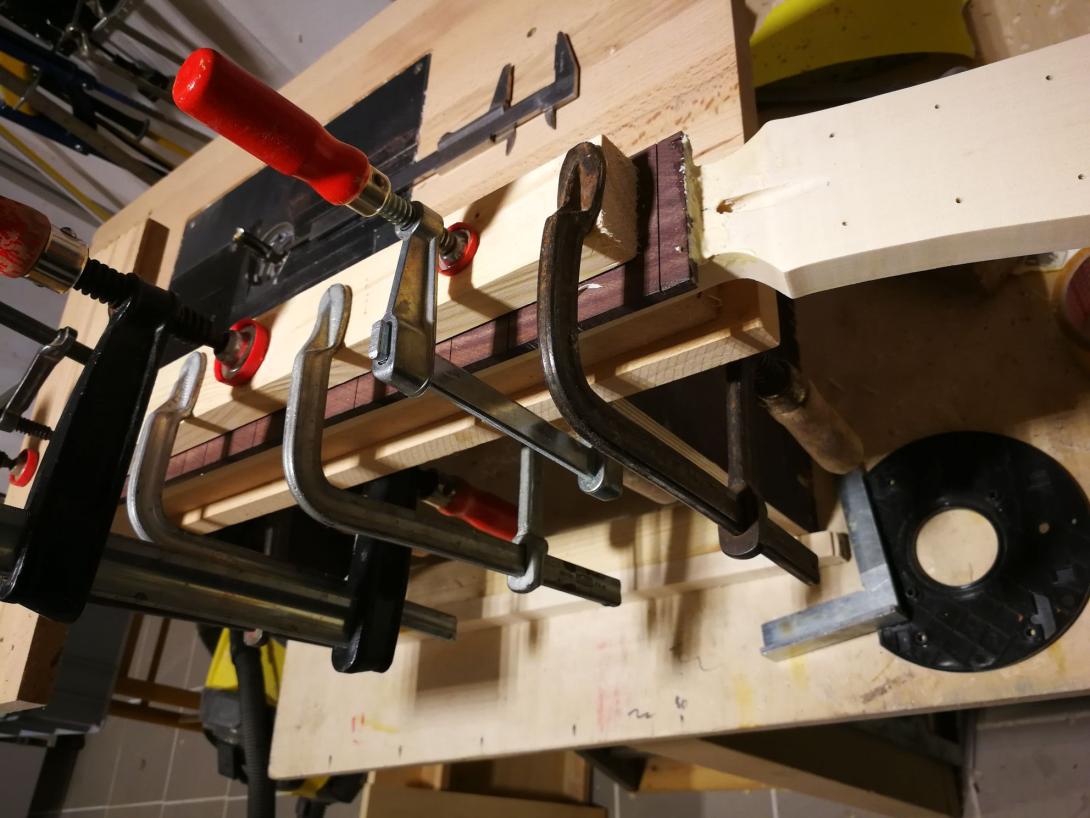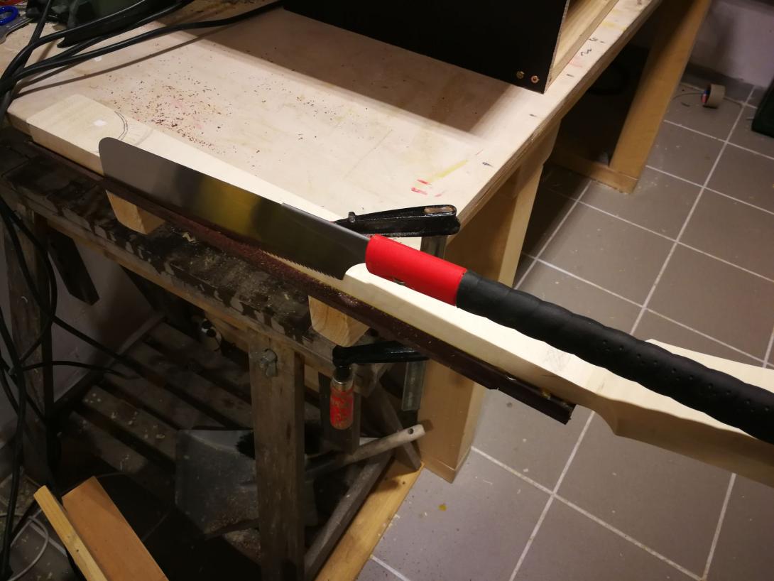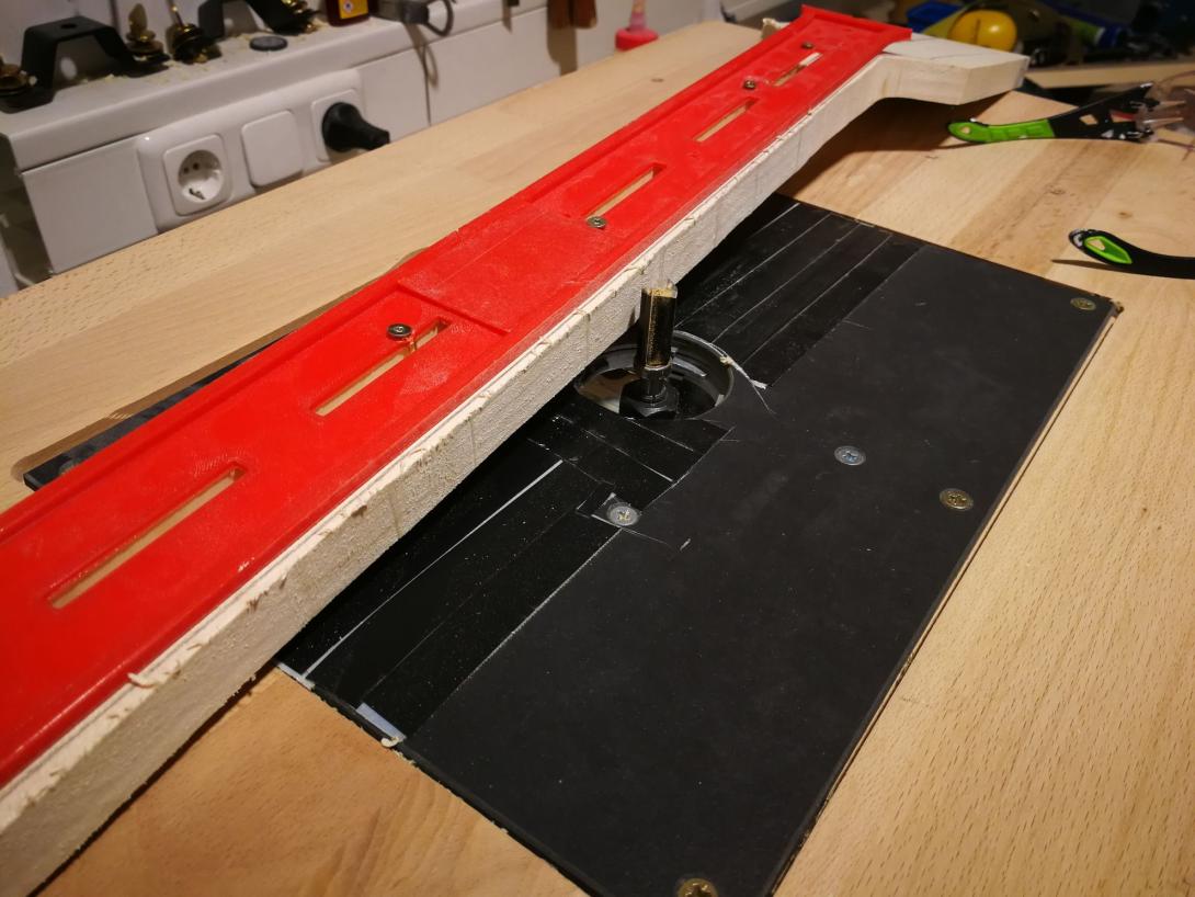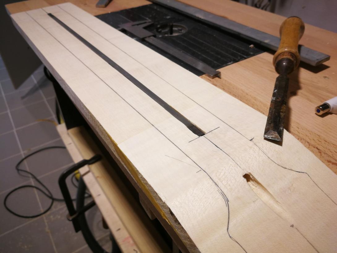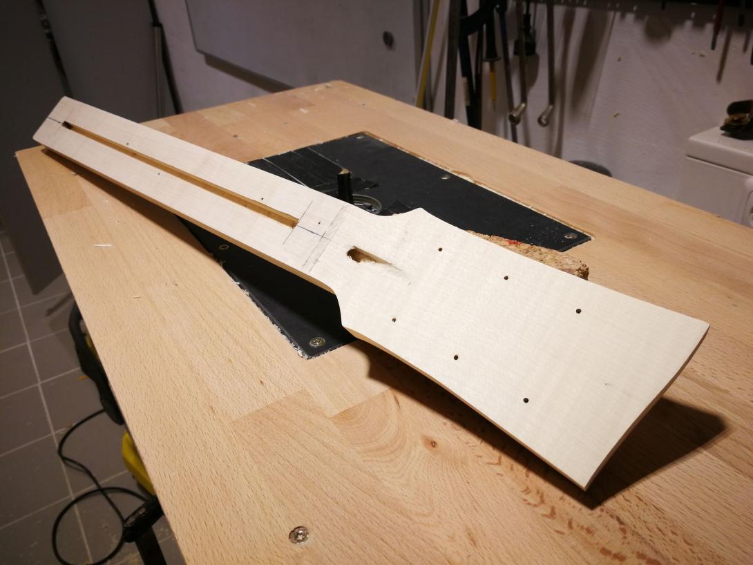 Zur Beruhigung habe ich parallel einen Gitarrenhals aus einem Fichtenbrett gebaut, das hat sich total gelohnt da viele Schritte geübt waren als es ernst wurde.